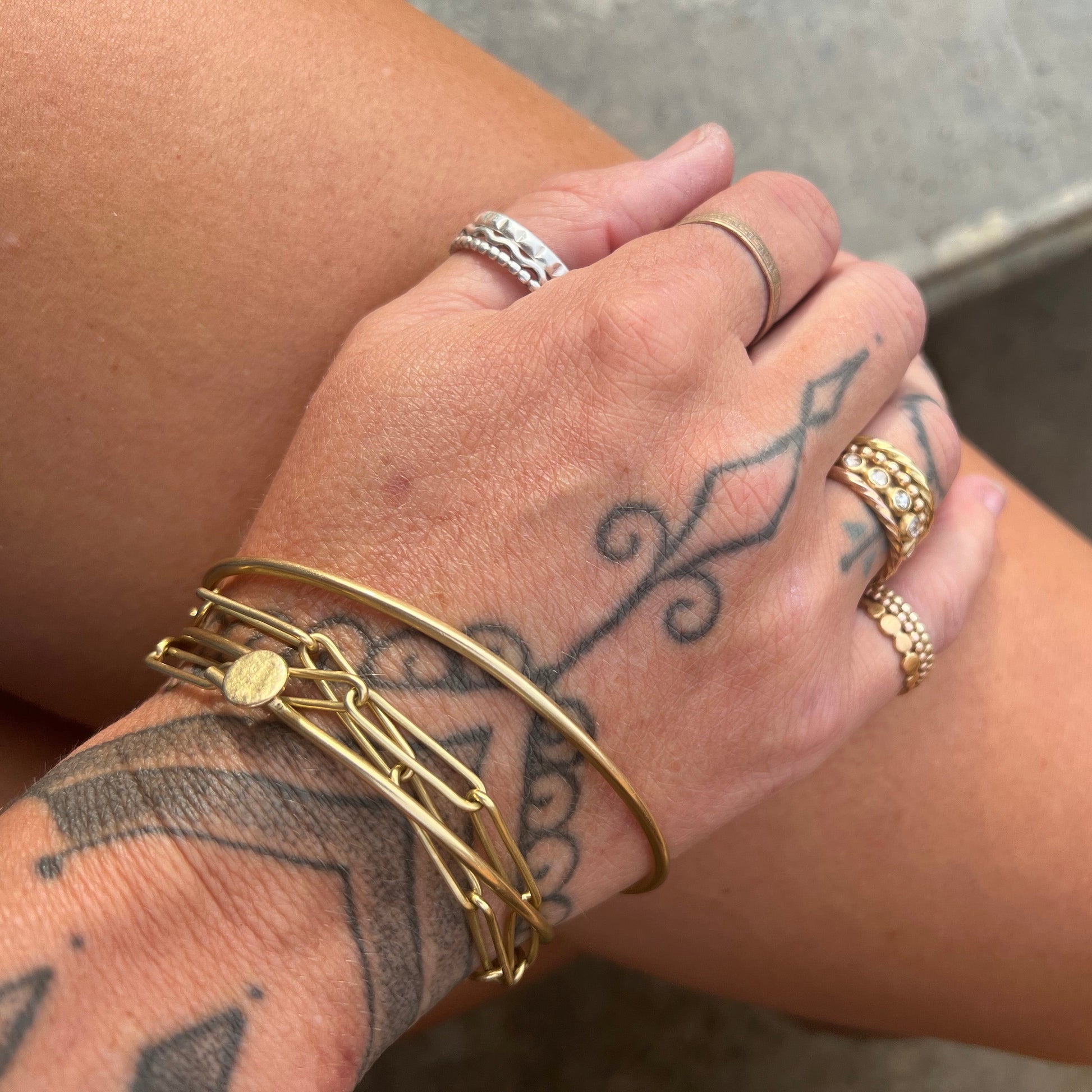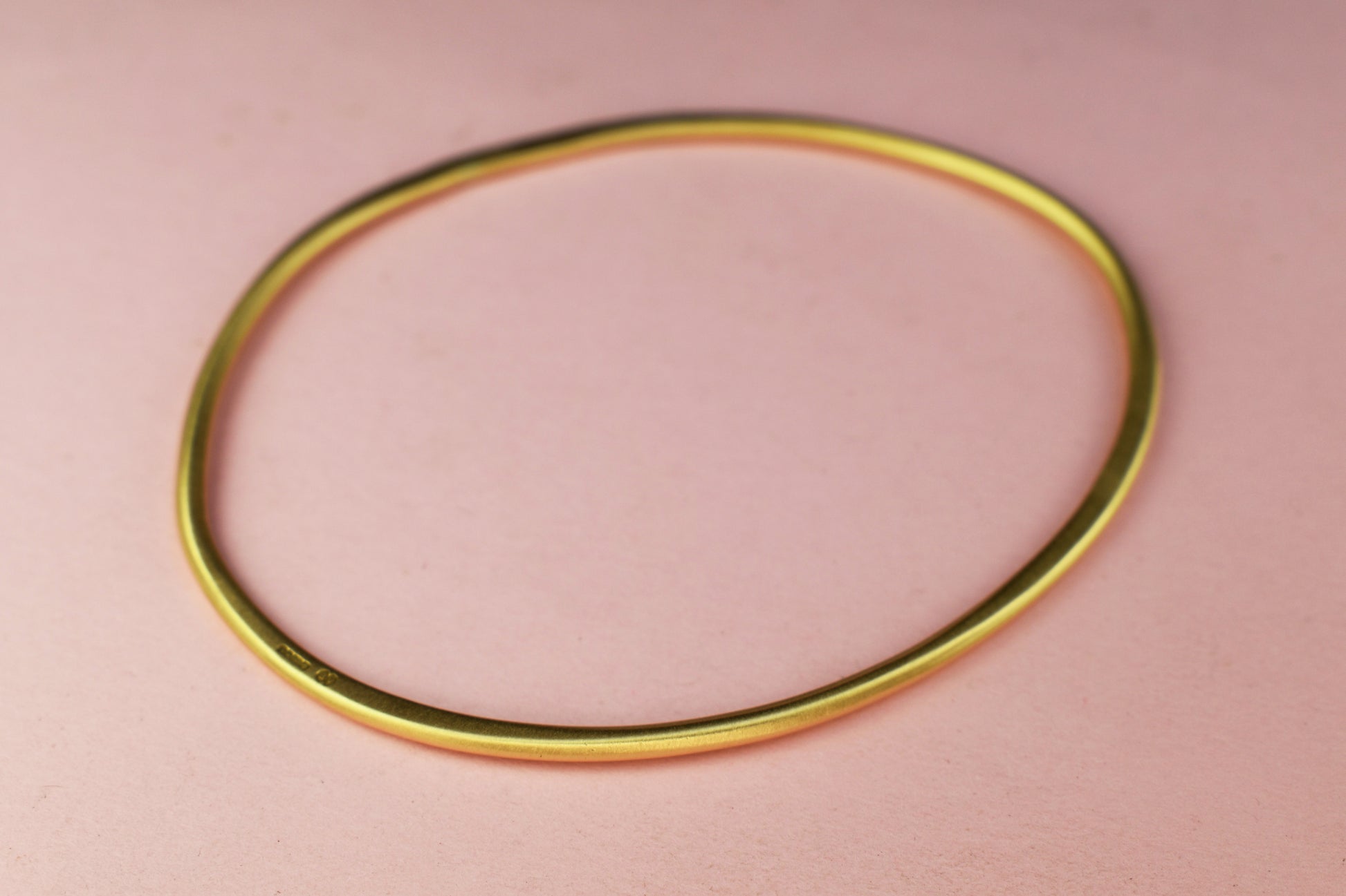 Crafted from 18ct recycled gold, this Pebble Bangle features an organic oval shape that exudes a natural elegance. Its versatile design makes it perfect for everyday wear, making it a functional yet stylish addition to any jewellery collection. With its authentic and sustainable materials, this bangle is the perfect choice for the conscious consumer.