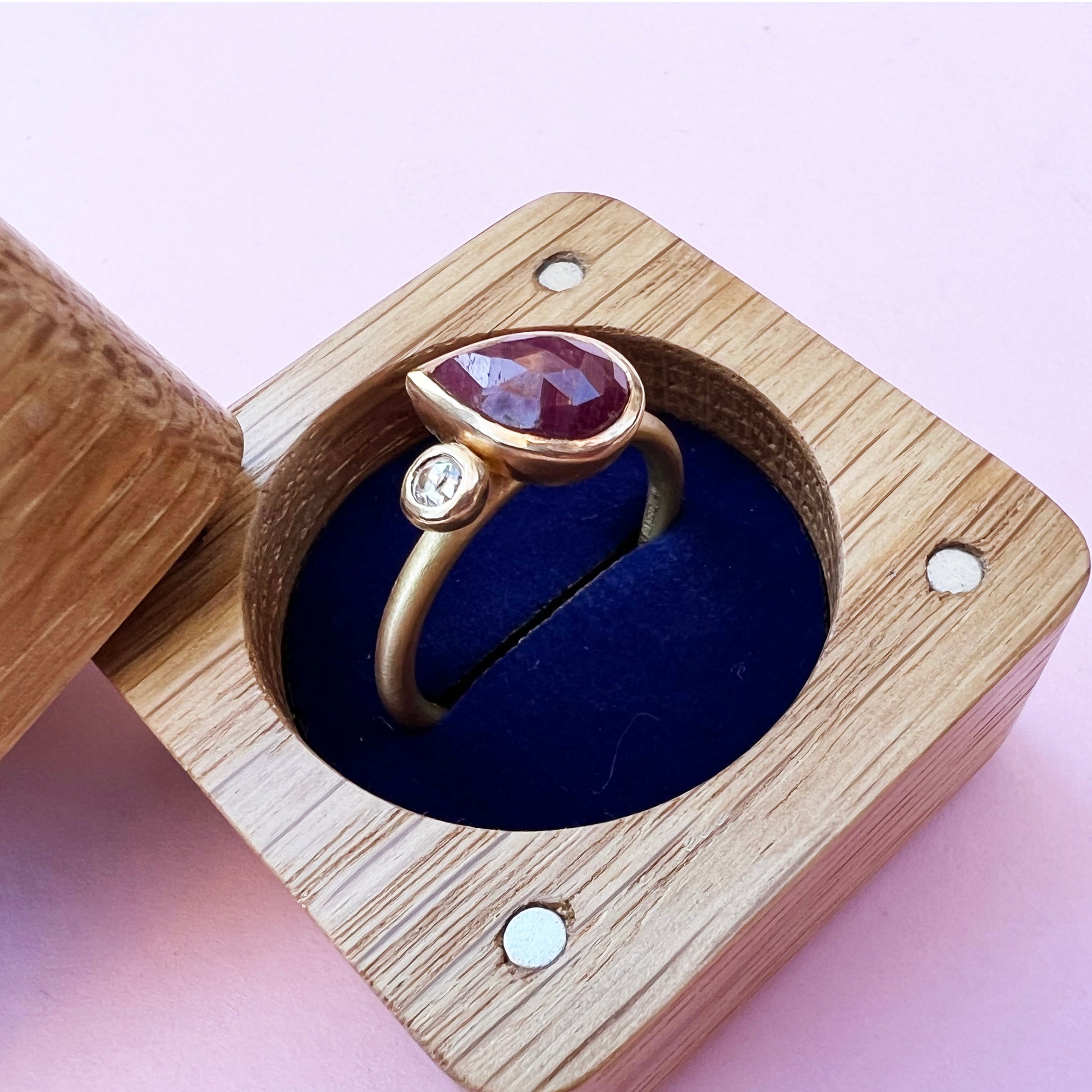 22ct & 18ct yellow gold and rose cut Ruby nestled next to a rose cut Pink DIamond, bezel set with a satin finish.