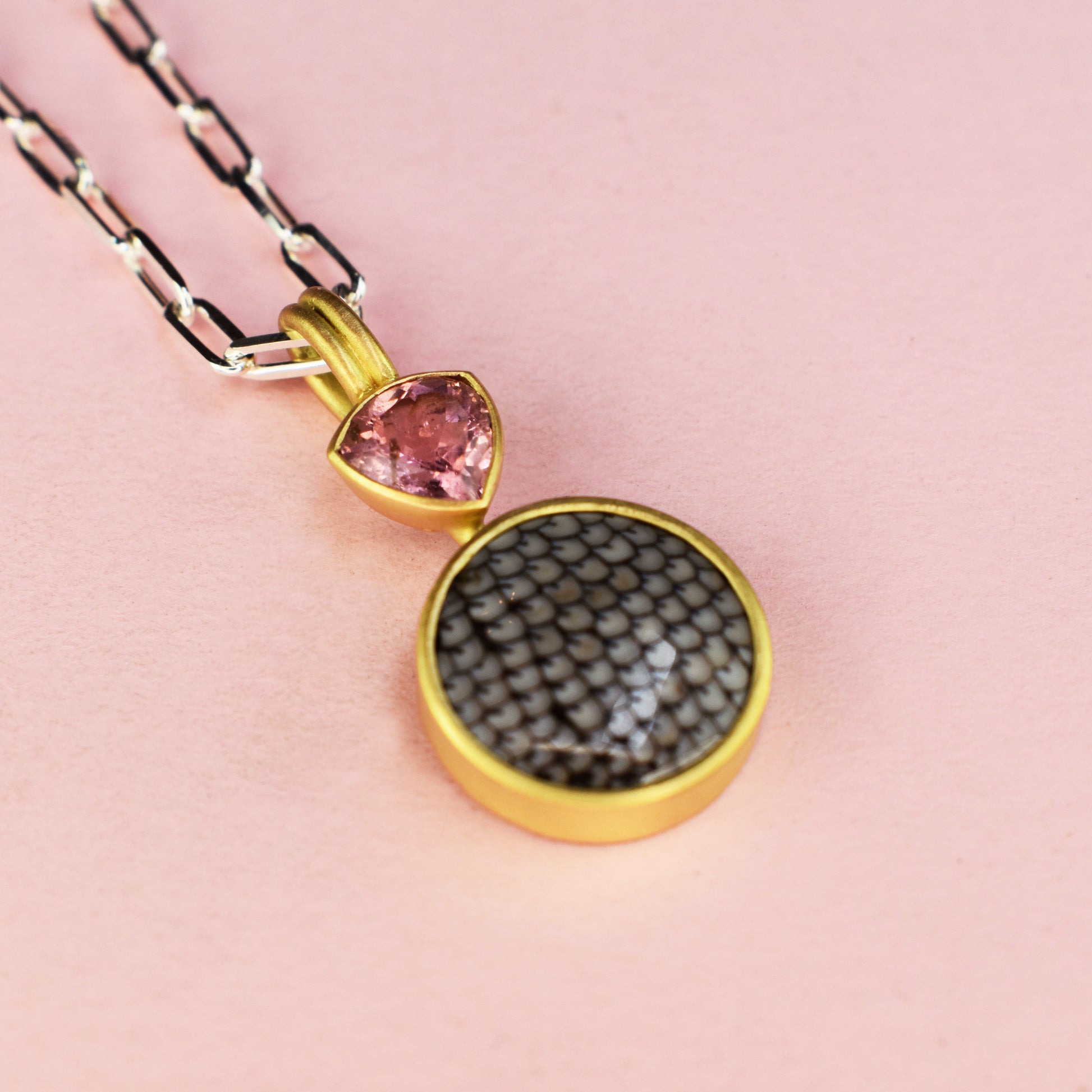 This pendant features a unique fossilised snake skin wrasse and a stunning pink tourmaline, ethically sourced and set in 18ct recycled yellow gold. The bezel setting adds a touch of sophistication to this statement piece, making it a must-have alternative for those seeking a one-of-a-kind accessory. Each pendant also fits on our handmade paperclip chains.