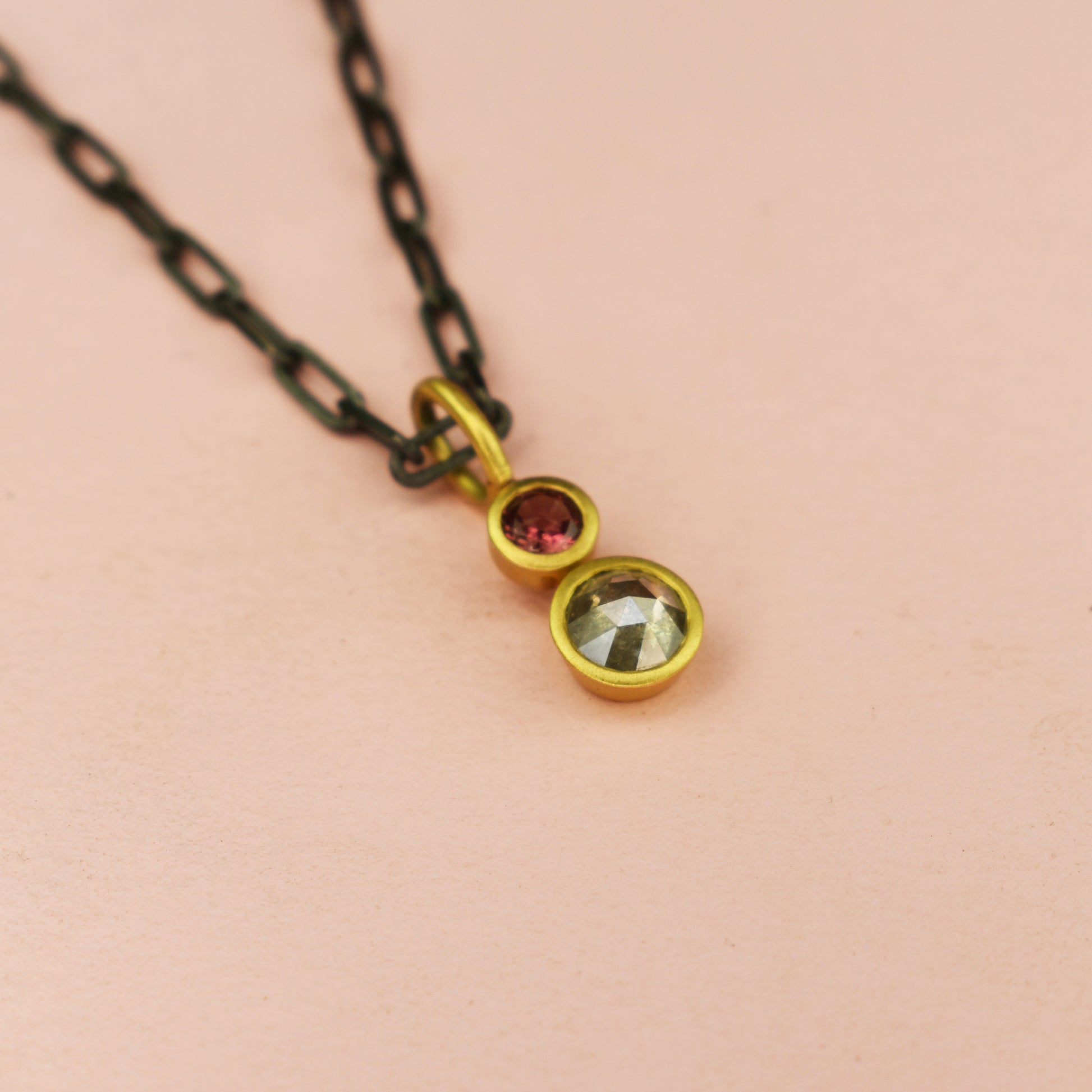 Indulge in the delicate luxury of our Rose Cut Grey Diamond and Tourmaline Pendant. This stunning statement piece adds a pop of colour to any outfit, with its layered design and intricate craftsmanship. Elevate your style with our exclusive pendant. Each pendant also fits onto our handmade paperclip chains.